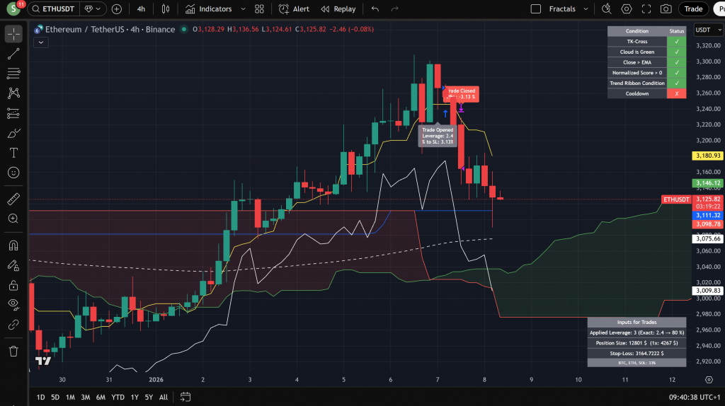 07/01/2026 – ETH Futures Trade Kommentar verfassen / Trades / Von admin Fail: -3.13 % Trade Properties: Market/Buy: 07/01/2026 5:00 Market/Sell: 07/01/2026 16:00 Entry Price: $ 3266.84 Close Price: $ 3164.72 Leverage: 2.4 (applied leverage: 3) % to Stop-loss: 3.13 % Gain/Loss: -3.13 %