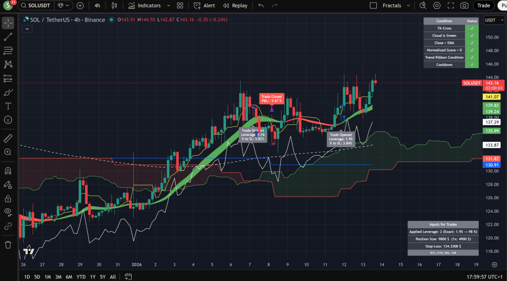12/01/2026 – SOL Futures Trade Kommentar verfassen / Trades / Von admin Open… Trade Properties: Market/Buy: 12/01/2026 1:00 Market/Sell: Open… Entry Price: $ 138.92 Close Price: Open… Leverage: 1.95 (applied leverage: 2) % to Stop-loss: 3.84 % Gain/Loss: Open…
