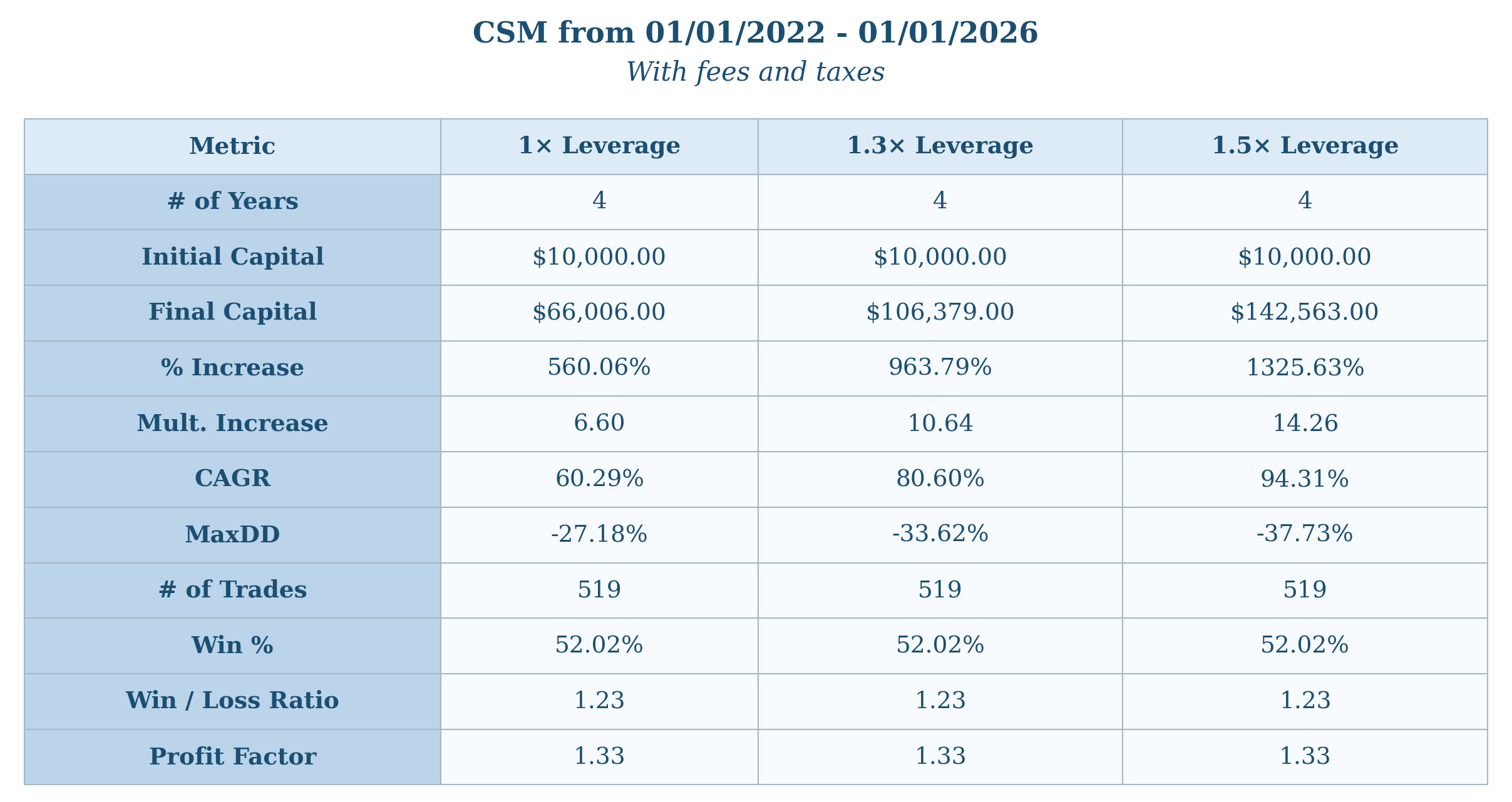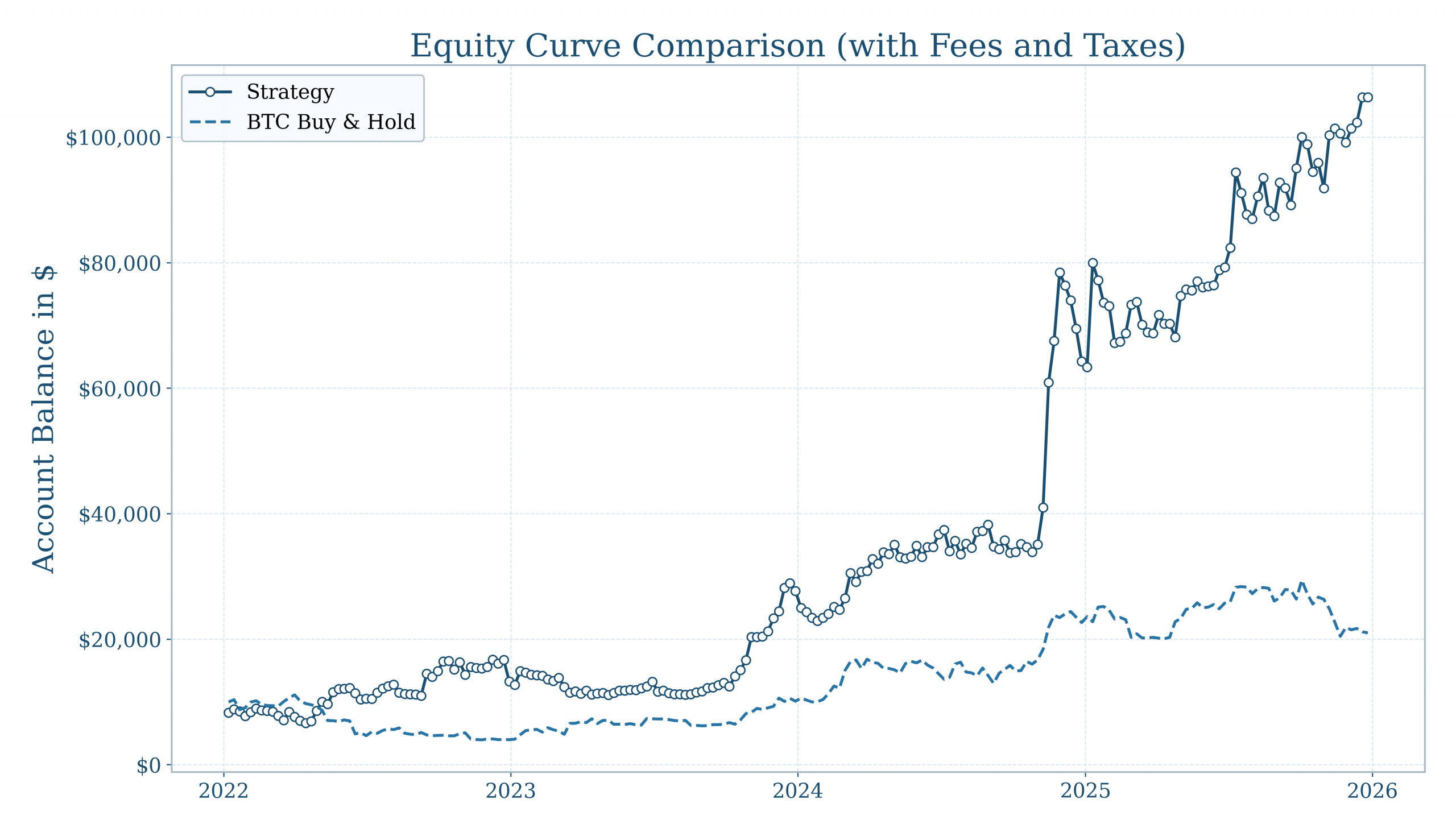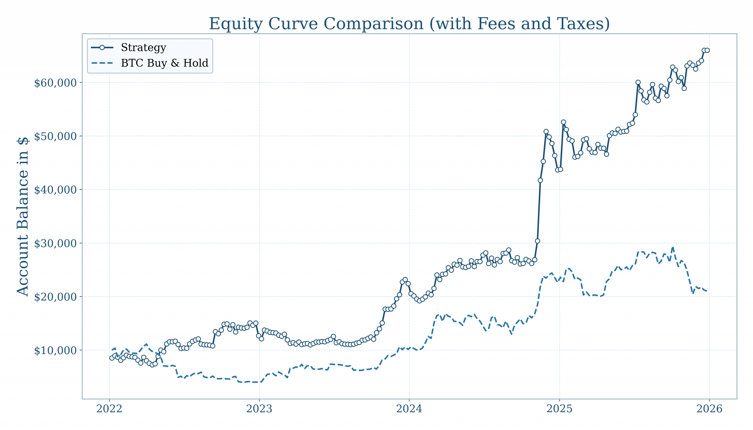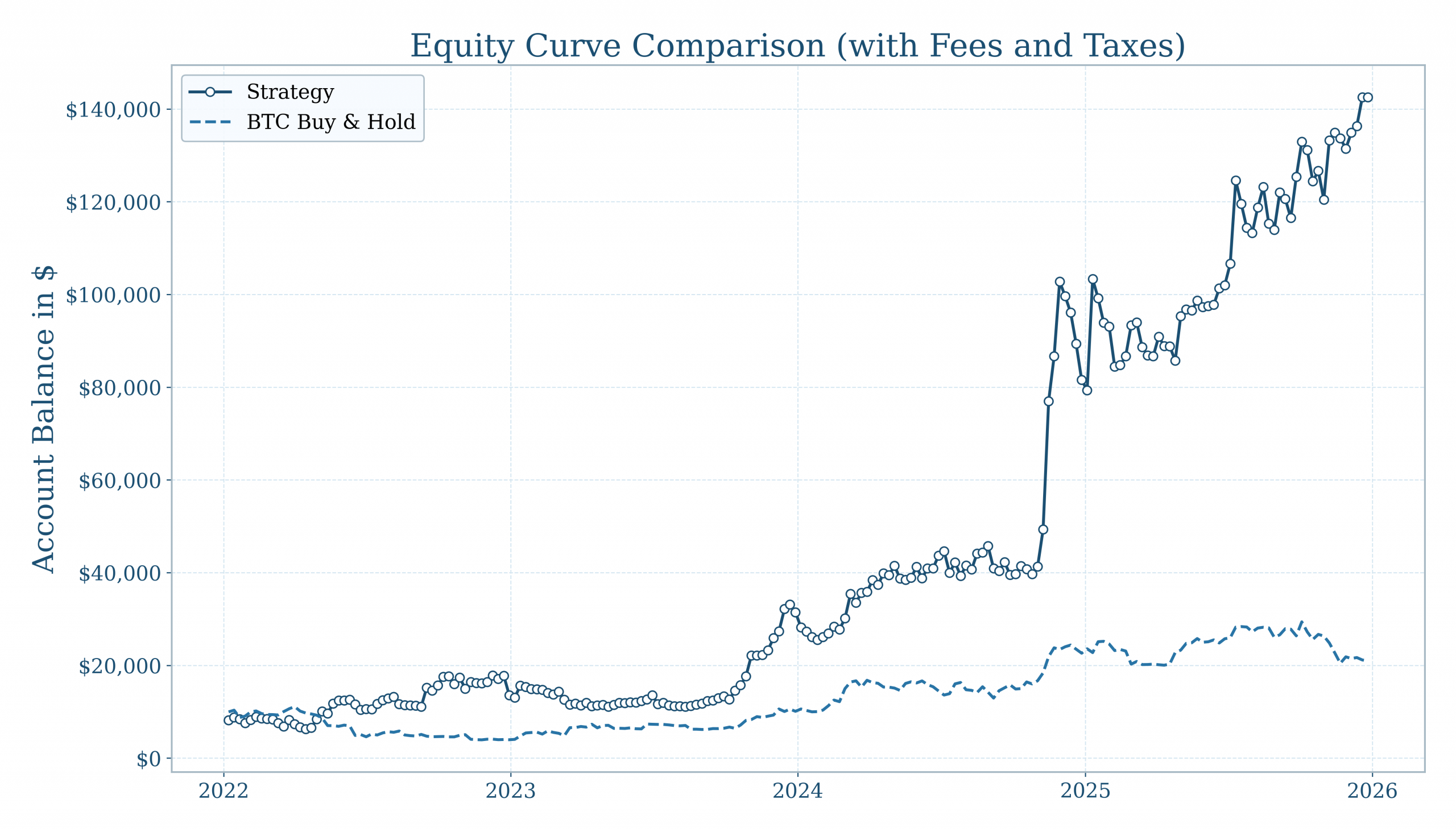 The following equity curve shows a comparison between the strategy equity curve and the BTC Buy & Hold equivalent from 2022 – 2026. The shown curve is for a 1x leverage and includes a default 0.1 % fee adjustment per trade. Taxes are included.