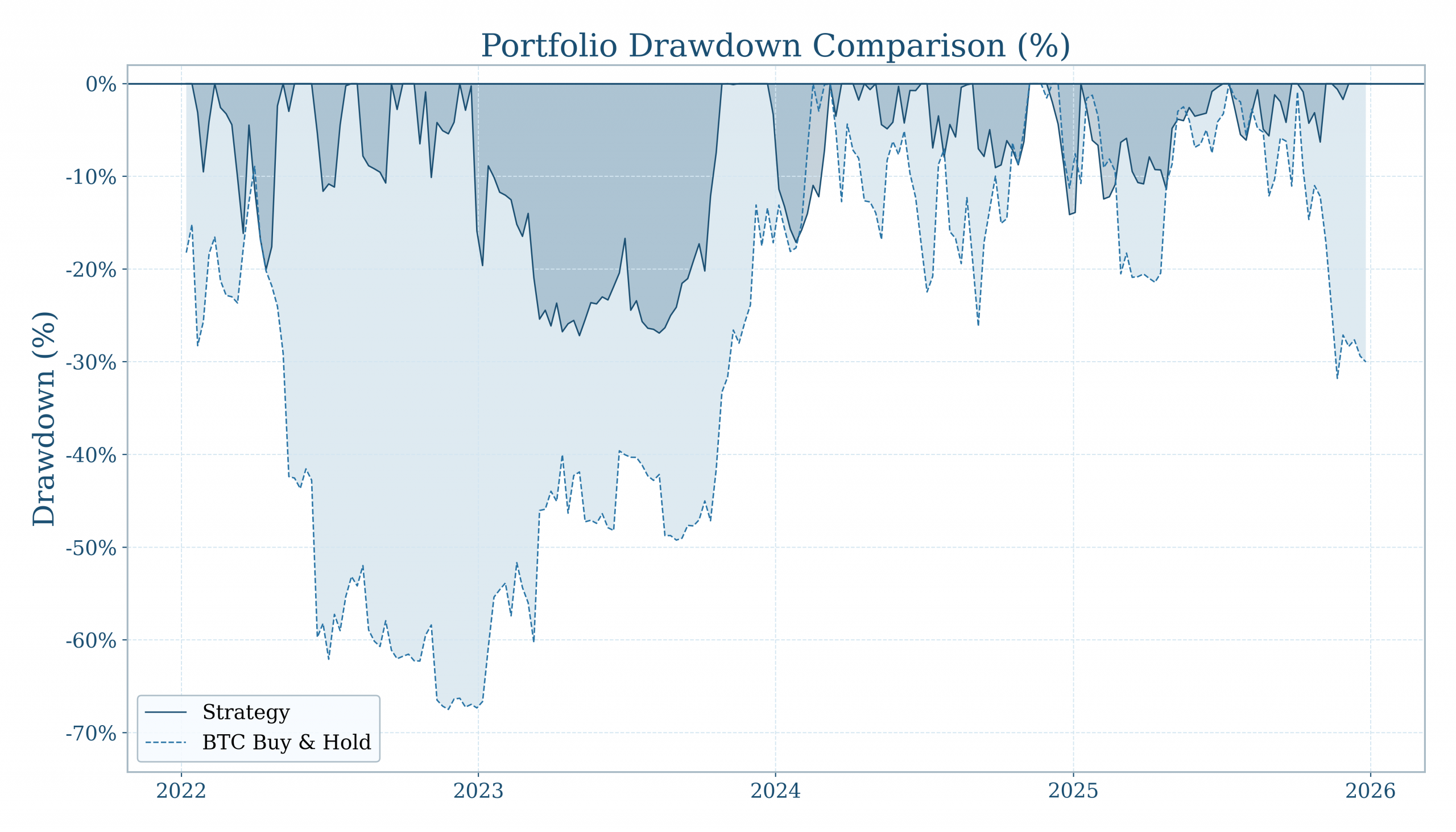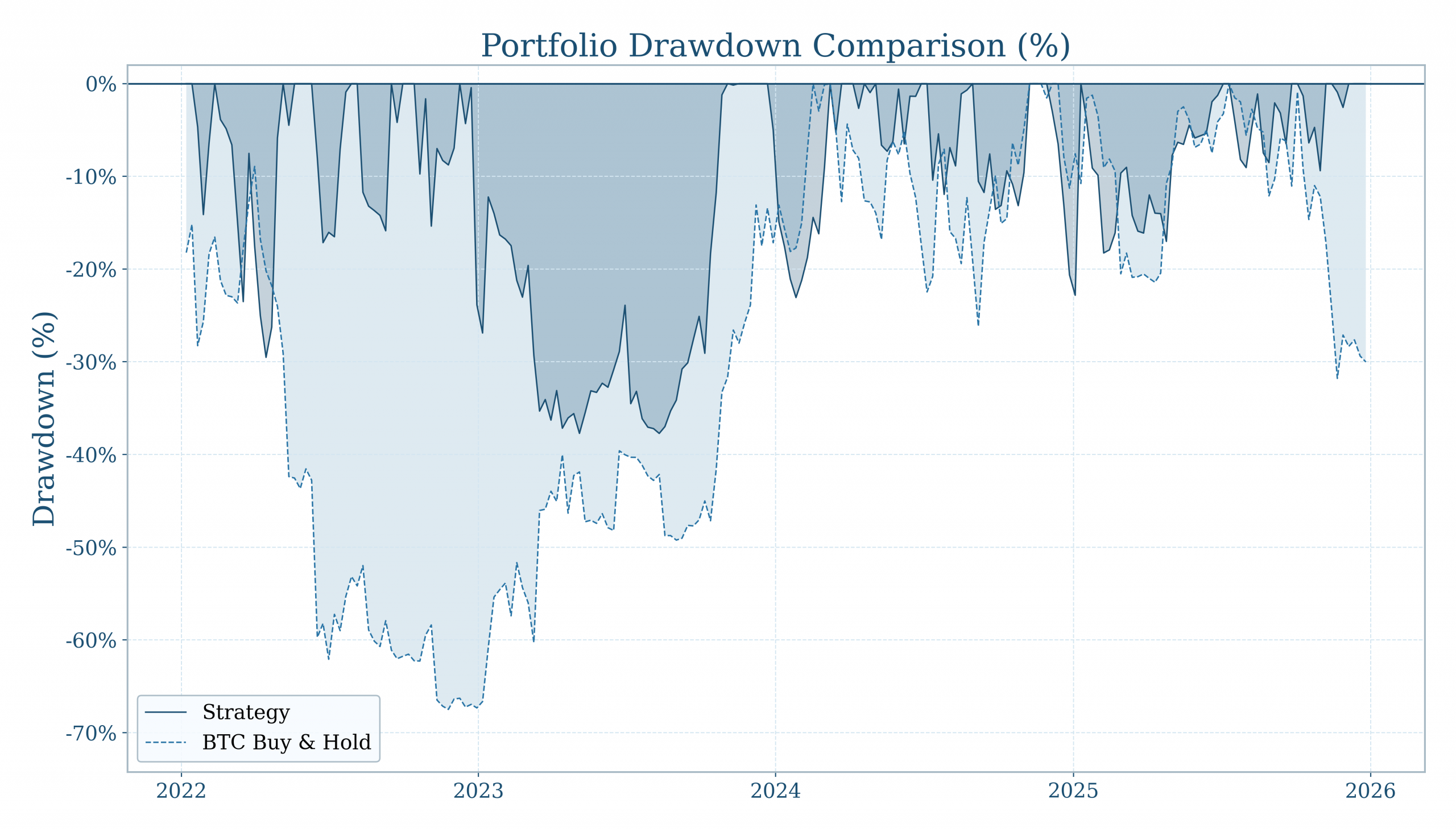 The following drawdown curve shows a comparison between the strategies‘ drawdown curve and the BTC Buy & Hold equivalent from 2022 – 2026. The shown curve is for a 1x leverage and includes a default 0.1 % fee adjustment per trade. Taxes are included.