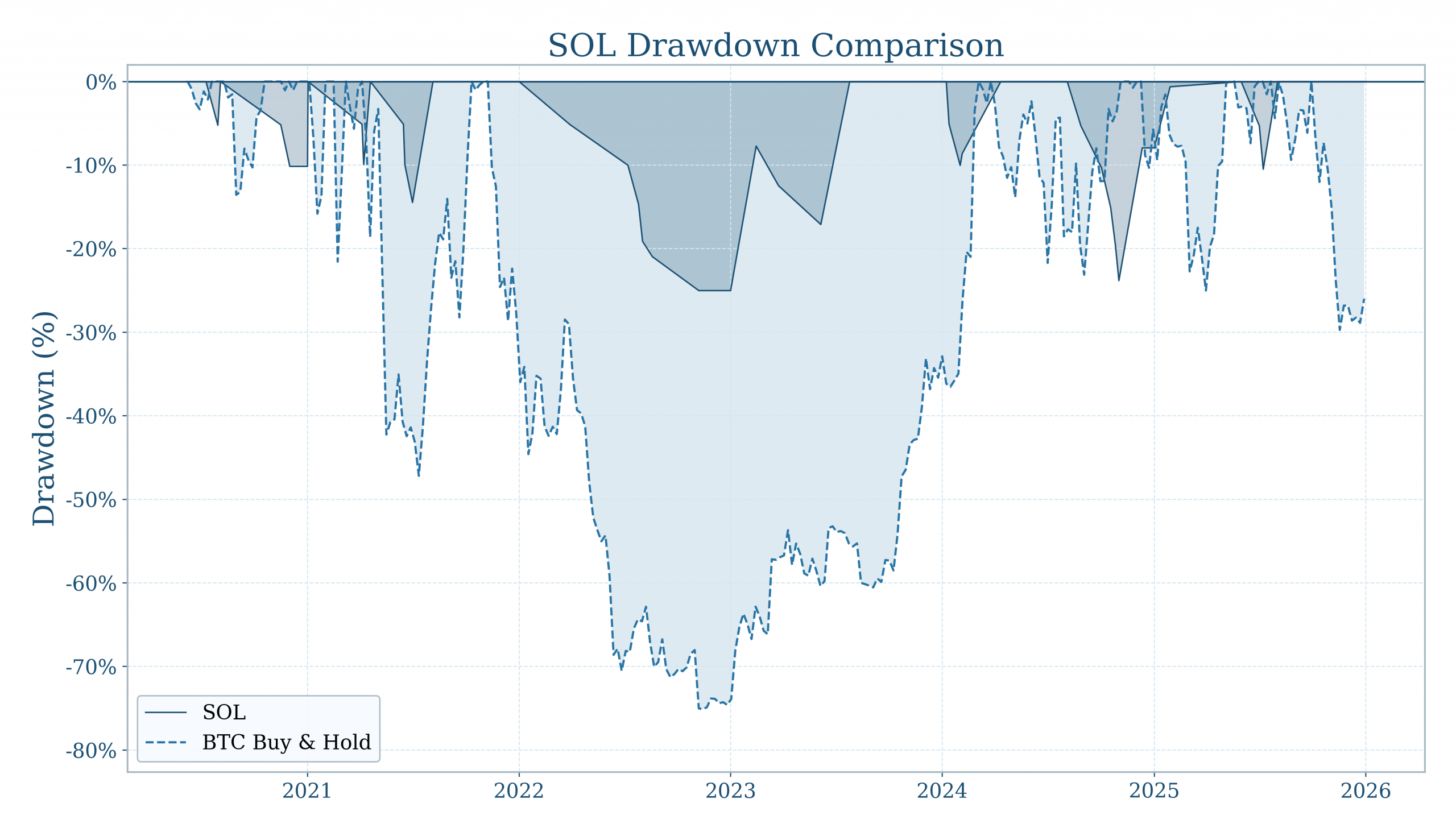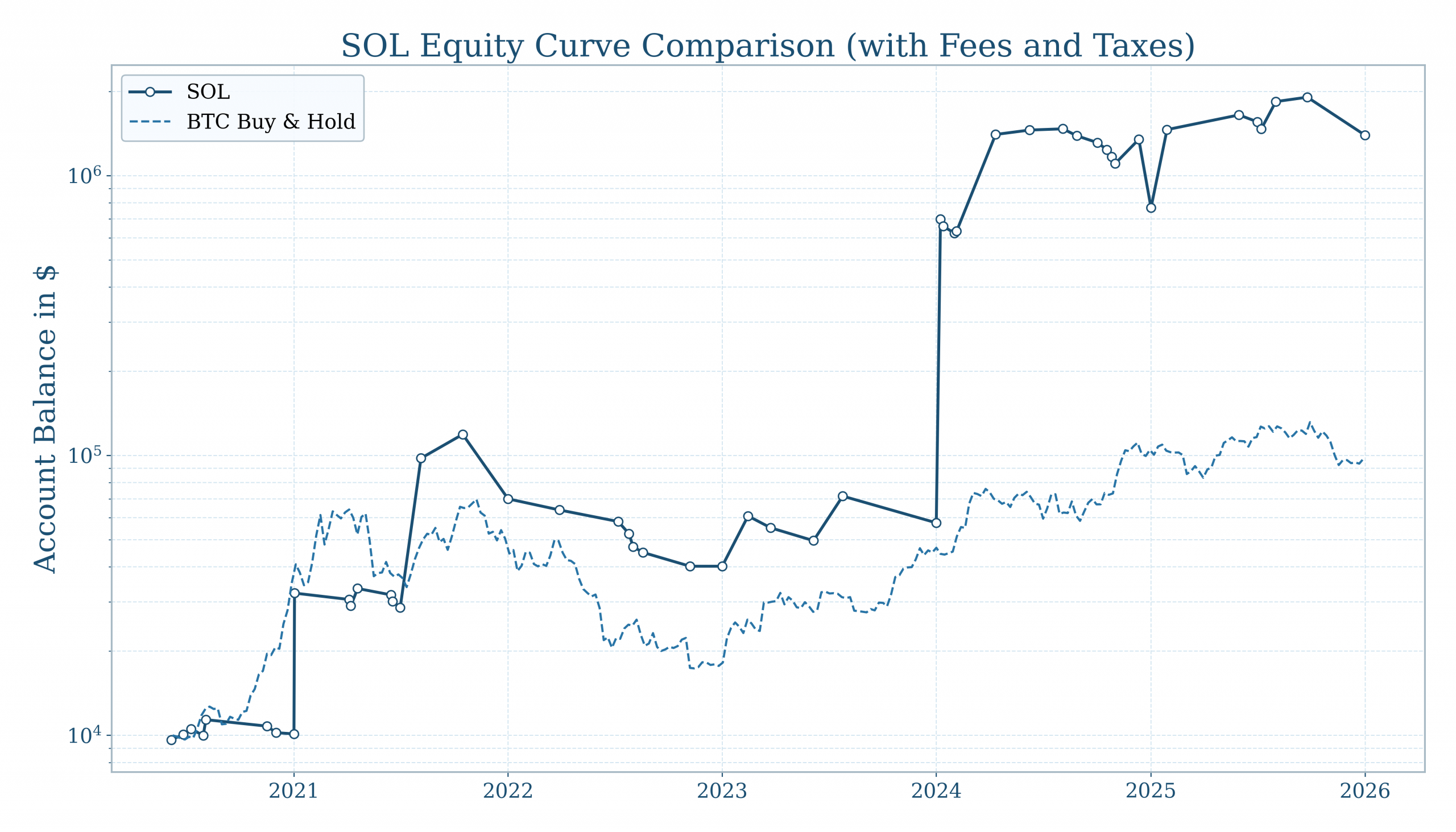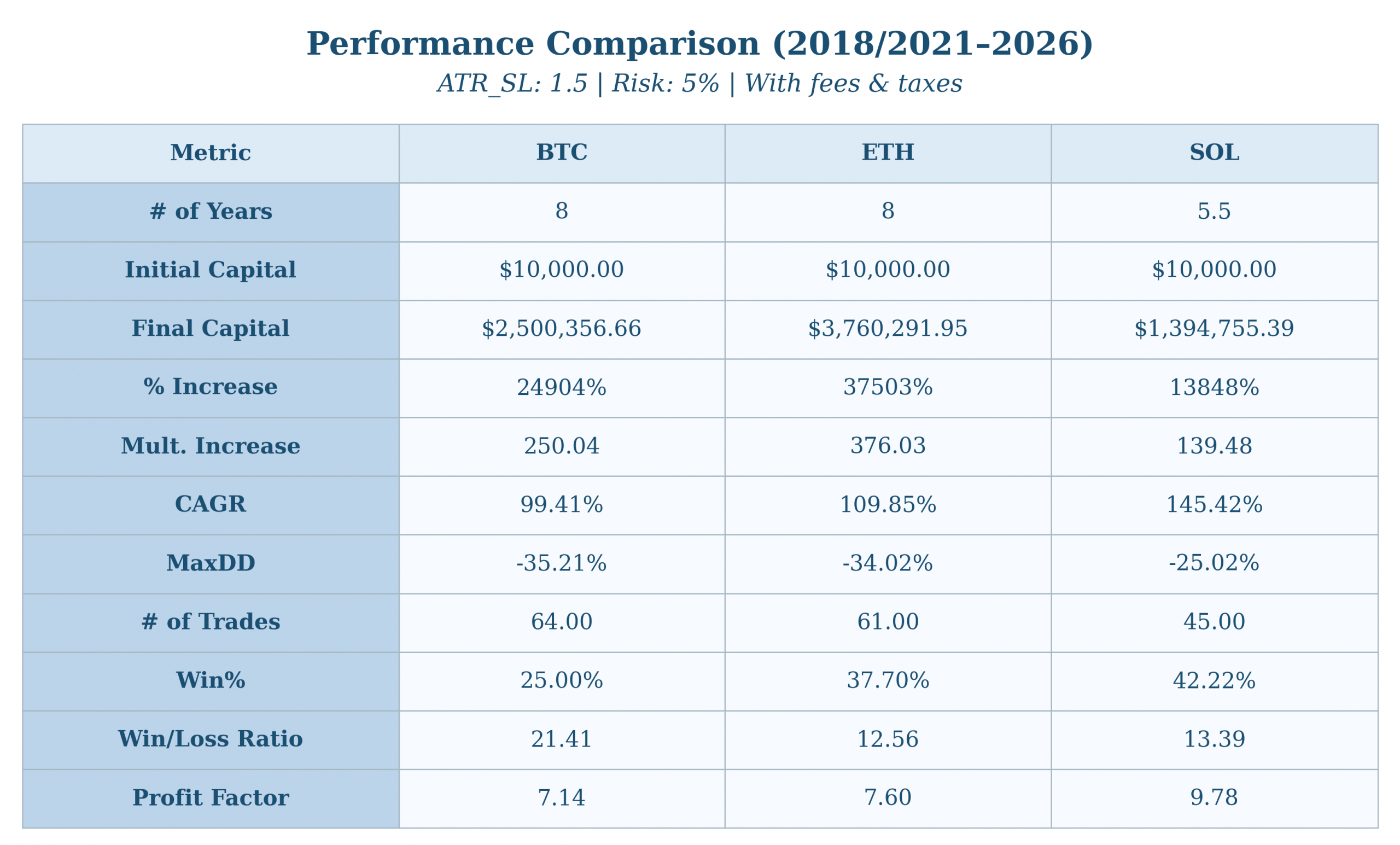 - Backtest duration: 01/01/2018 – 01/01/2026 (BTC and ETH), 01/06/2020 – 01/01/2026 (SOL)