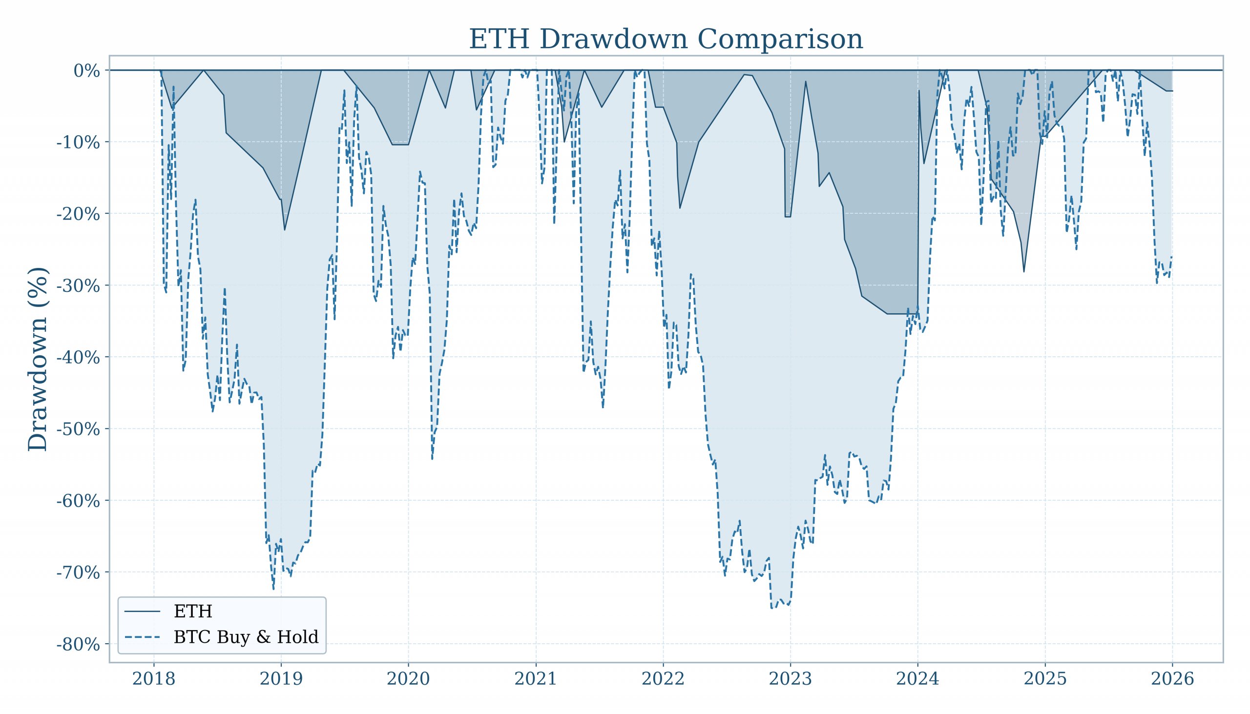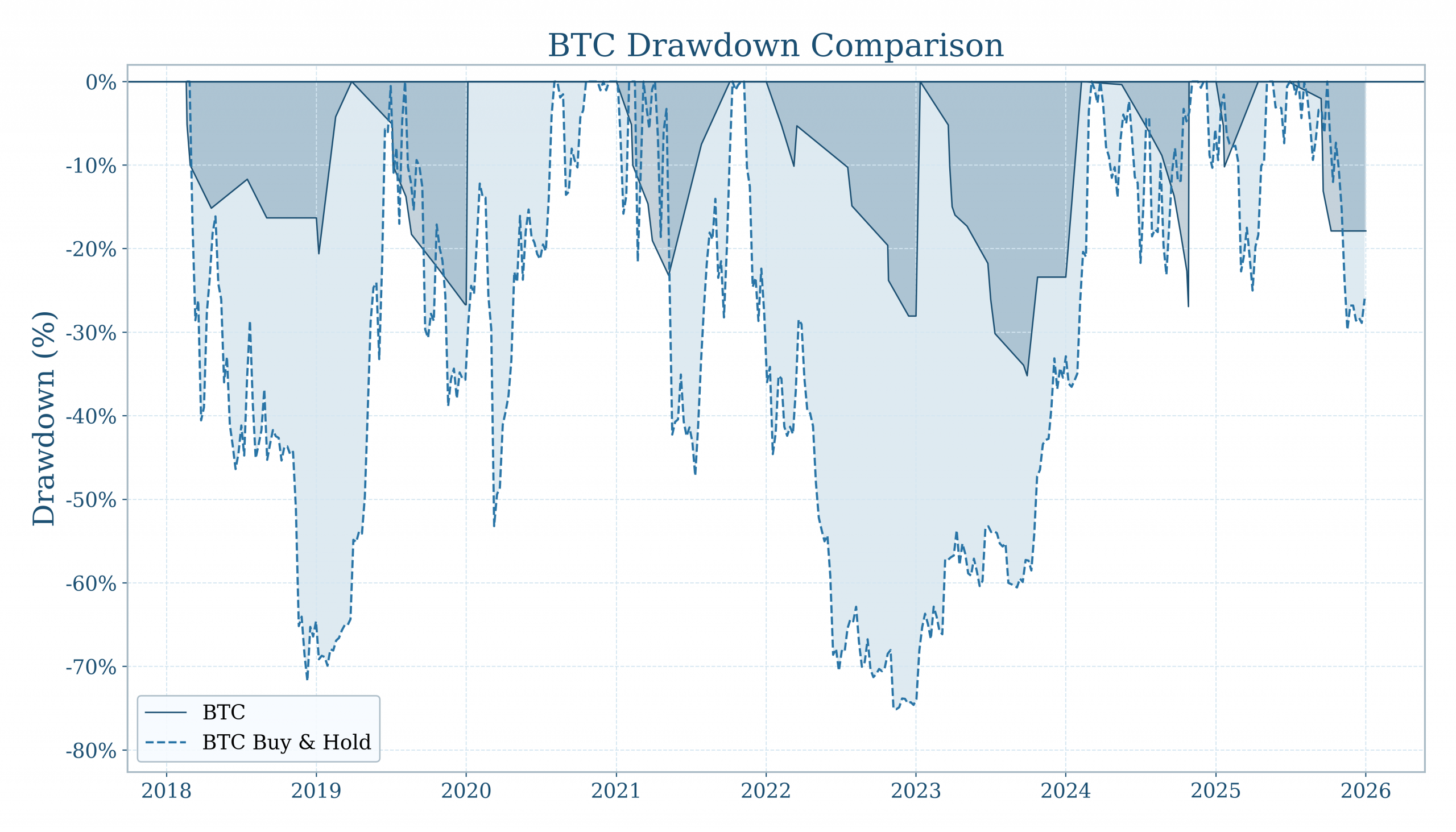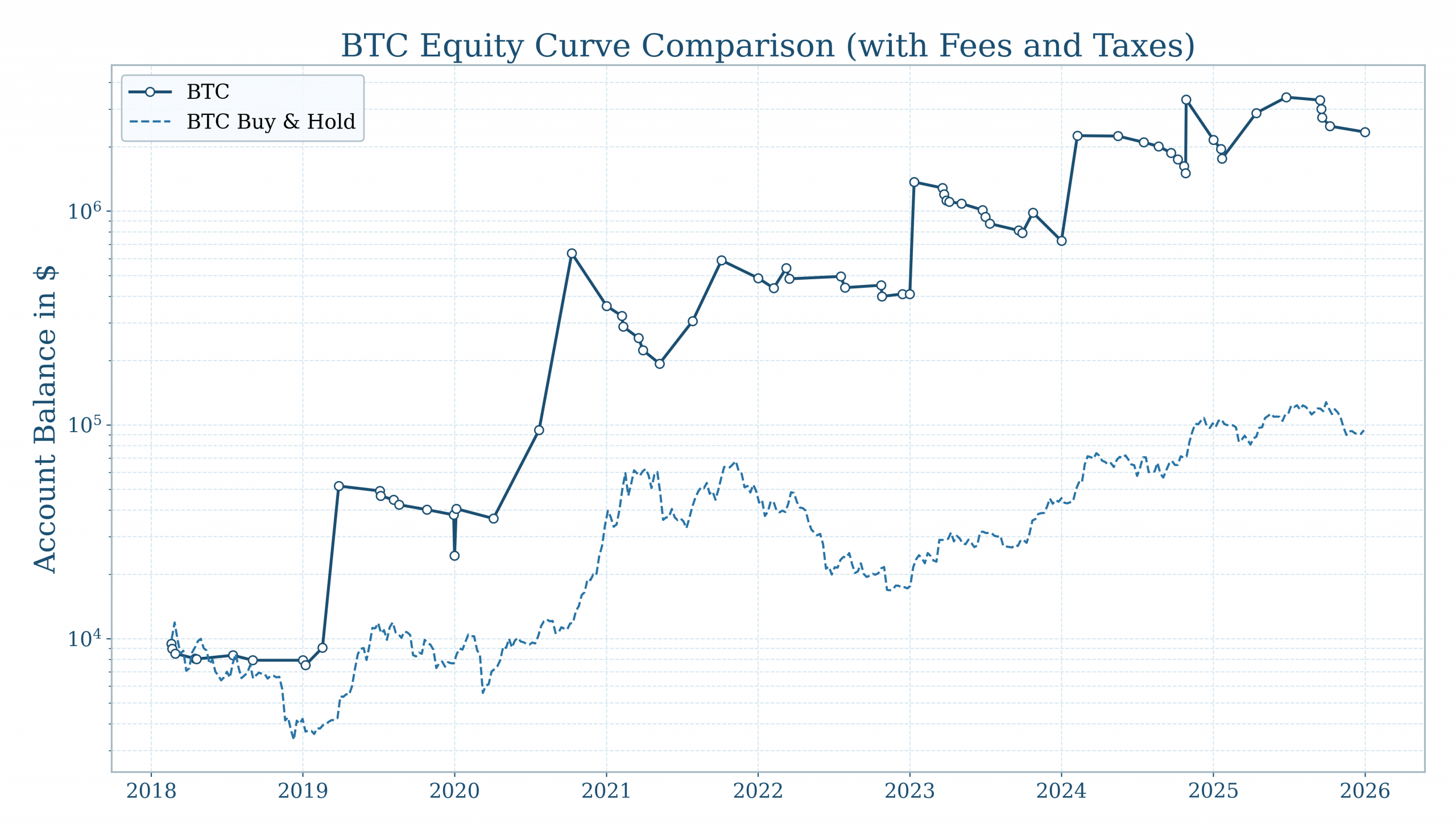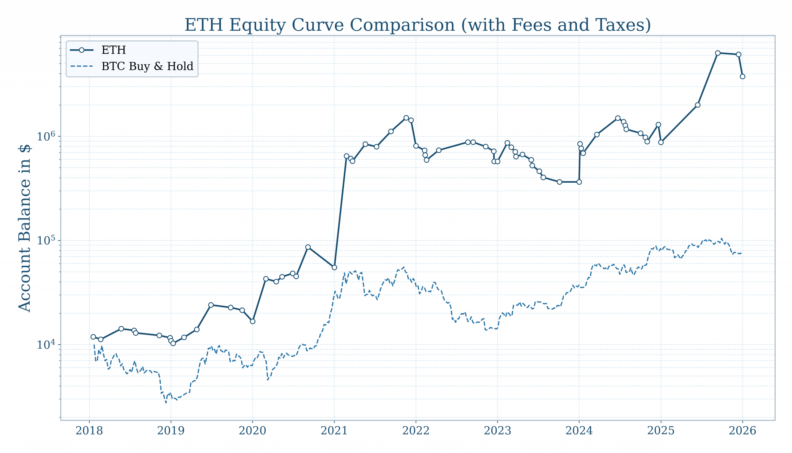 - Backtest duration: 01/01/2018 – 01/01/2026 (BTC and ETH), 01/06/2020 – 01/01/2026 (SOL)