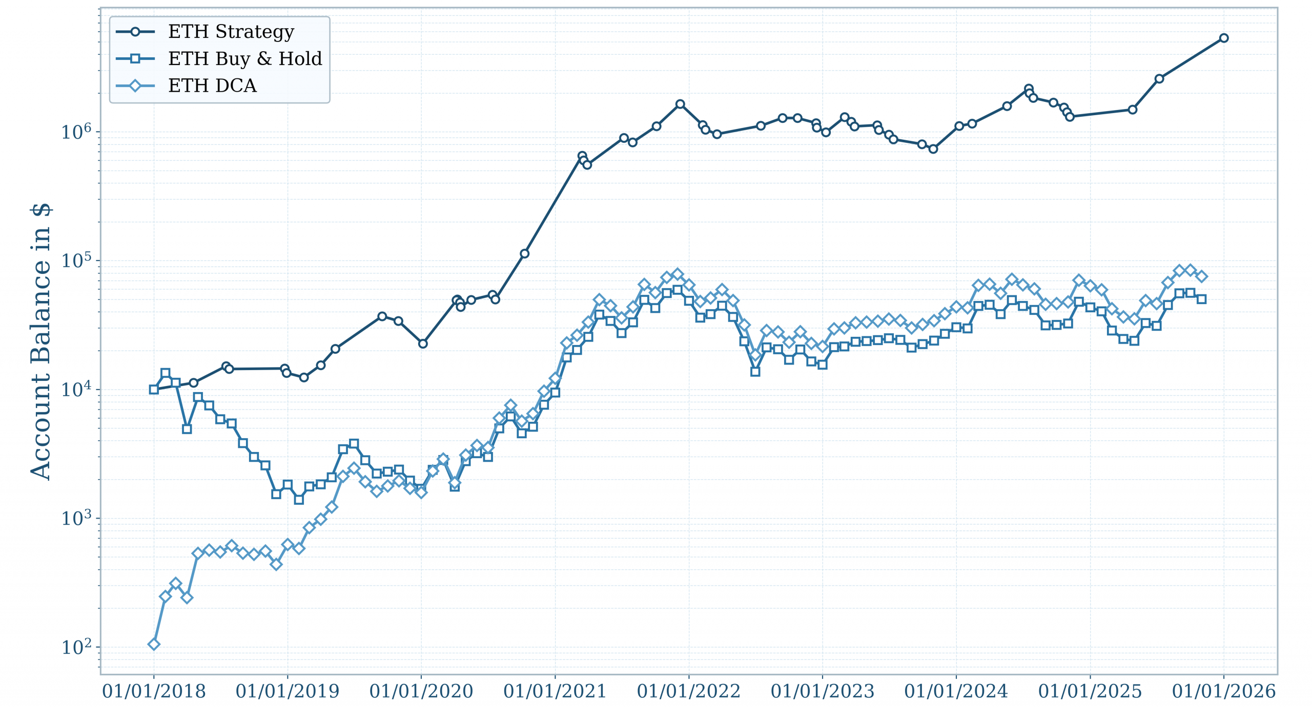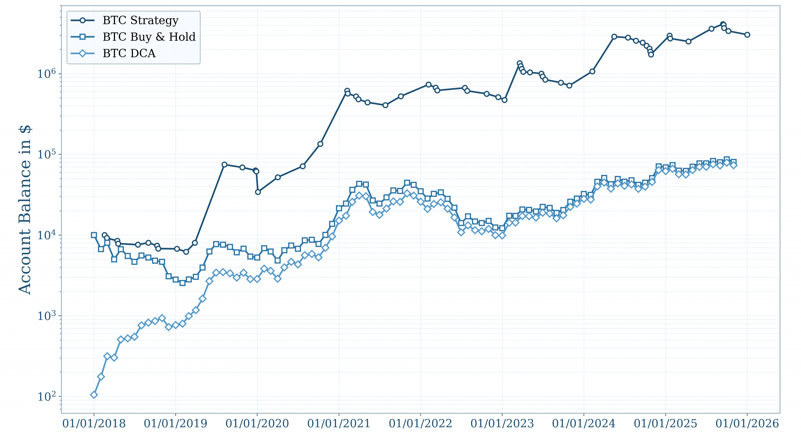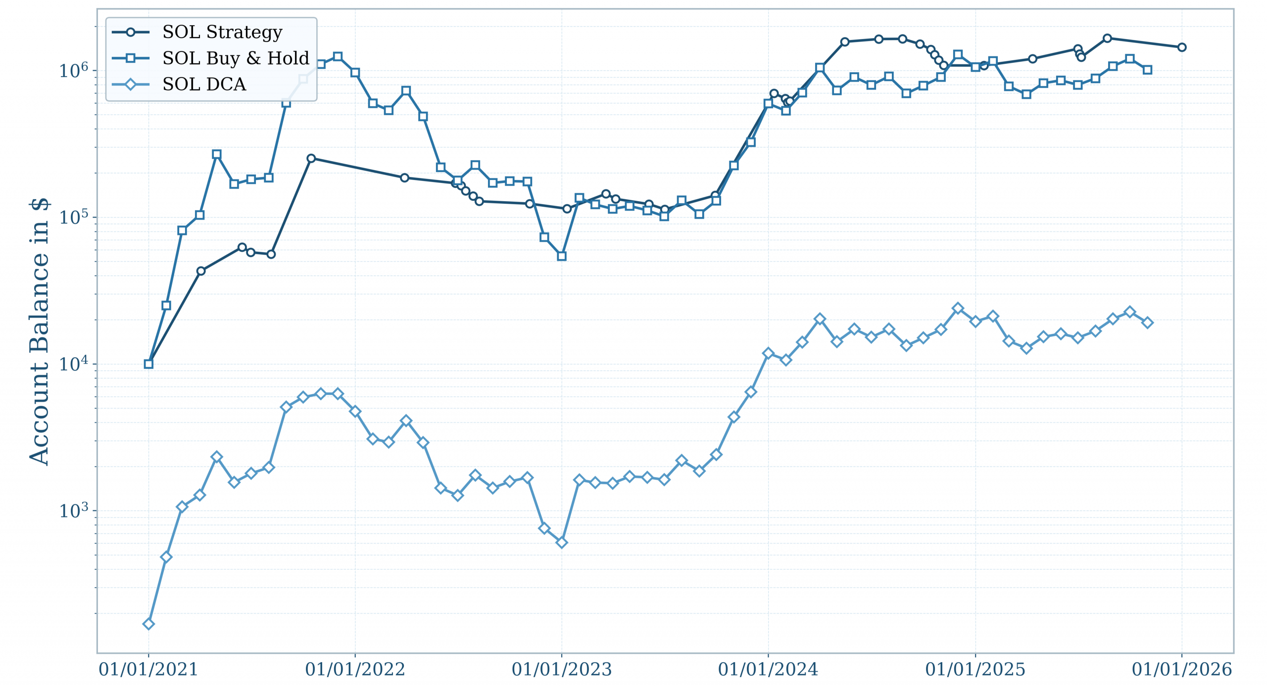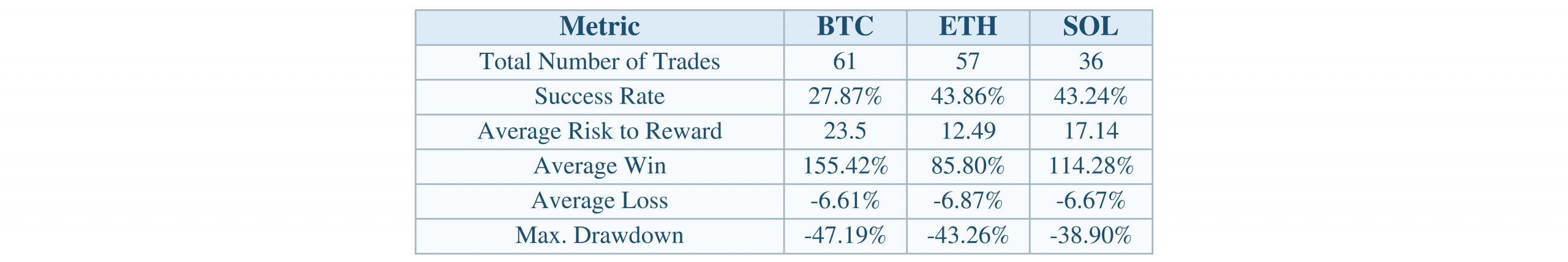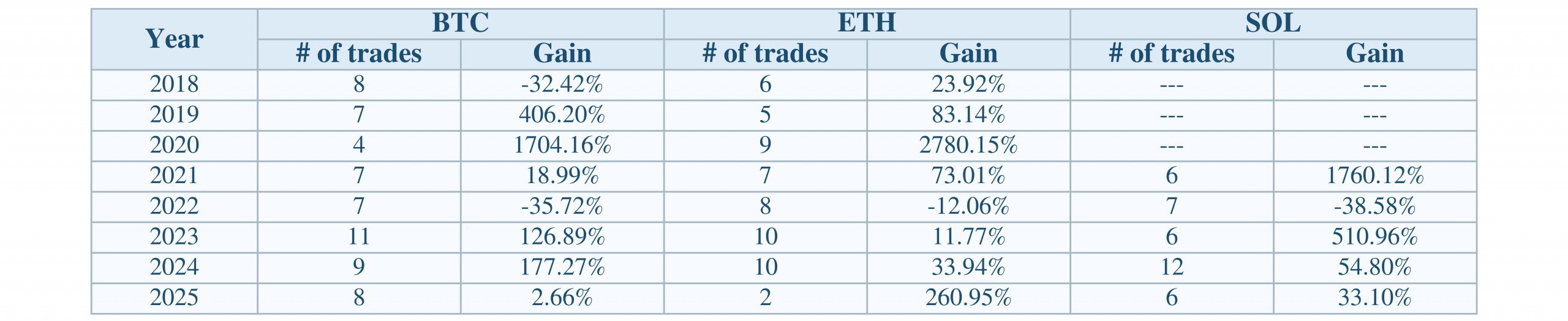The table below shows the strategy approach performance for the three assets BTC, ETH and SOL. BTC and ETH were tested from 01/01/2018 until 01/11/2025. SOL was tested from 01/01/2021 until 01/11/2025.