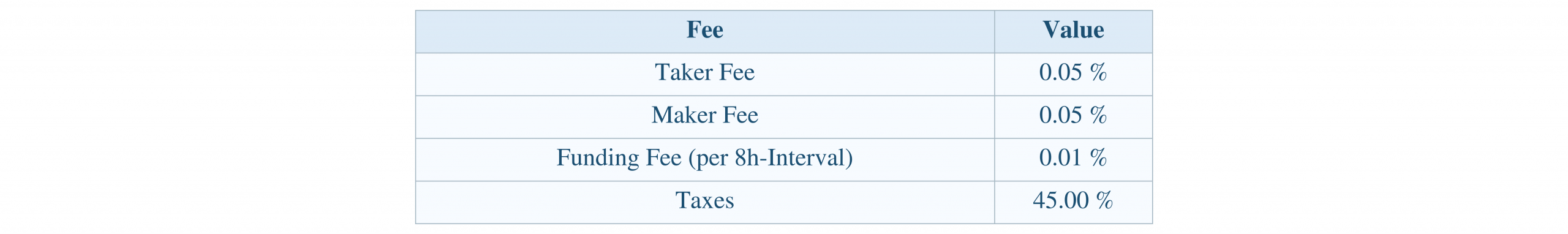 For realistic backtesting results, it is essential to consider trading fees. Since the strategy uses Spot-trading as well as Futures-trading, Maker-, Taker-, and Funding-fees apply. Additionally, worst case taxes need to be assumed.