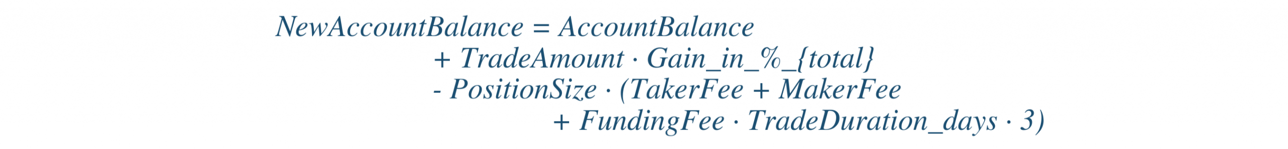 In contrast to the DCA approach, funding fees are applicable and have been incorporated into the overall performance calculations. The total return and maximum drawdown are highly sensitive to the assumed loss threshold per trade. In the baseline configuration, a 7.5% loss limit per trade is employed, which can be regarded as relatively aggressive. Given that the three assets (BTC, ETH, and SOL) are each allocated 33% of the total account balance, a single trade corresponds to a potential maximum loss of approximately 2.5% relative to the total balance. Nevertheless, if three trades are executed simultaneously, the cumulative loss in the worst-case scenario could amount to 7.5% of the total account balance. To compute the account balance and gains/losses over time, the following calculations are made.