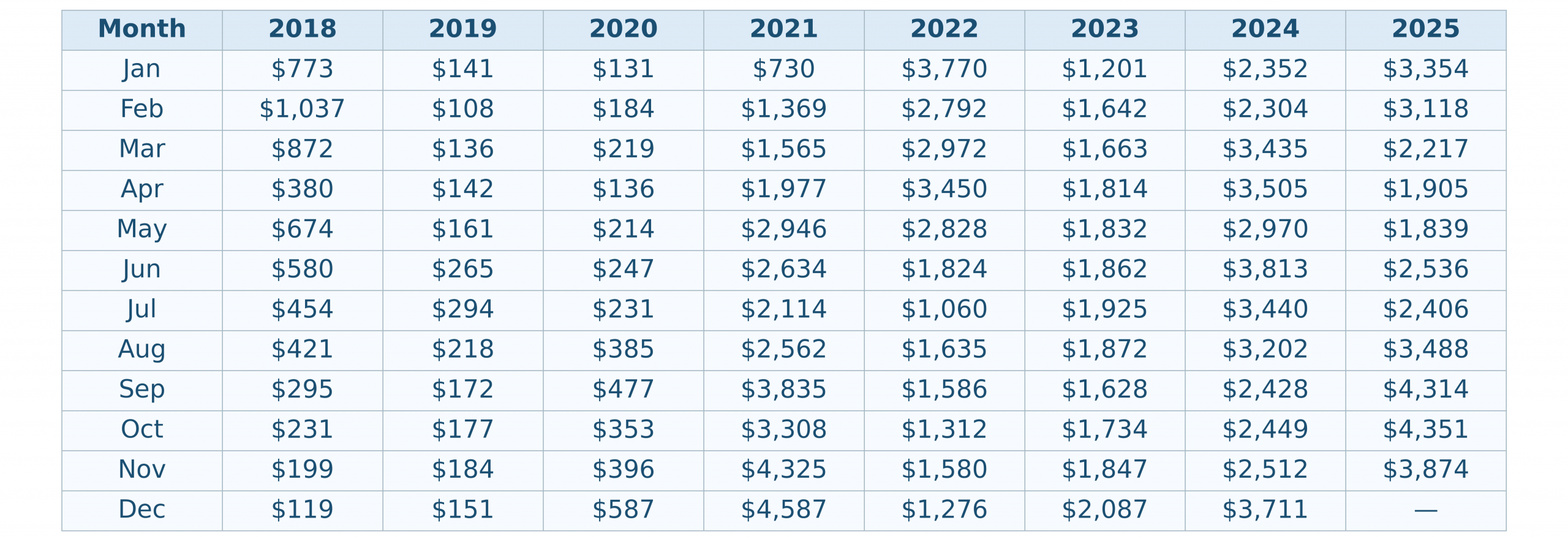 The same concept is applied to the assets ETH and SOL. The table below shows the ETH prices from January 1st, 2018 until November 1st, 2025.