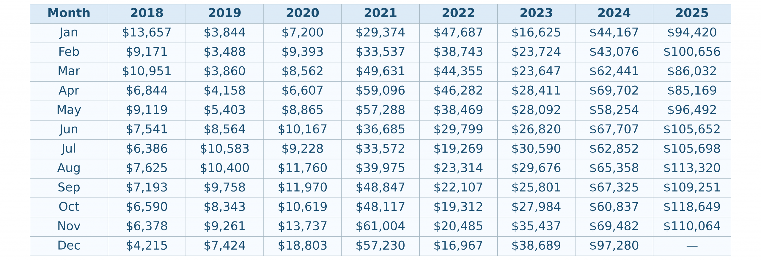 Assuming a time-span from January 1st, 2018 until November 1st, 2025, the BTC price for each first day of a new month were:
