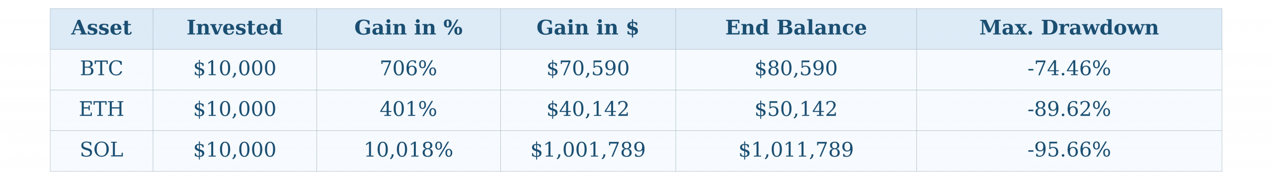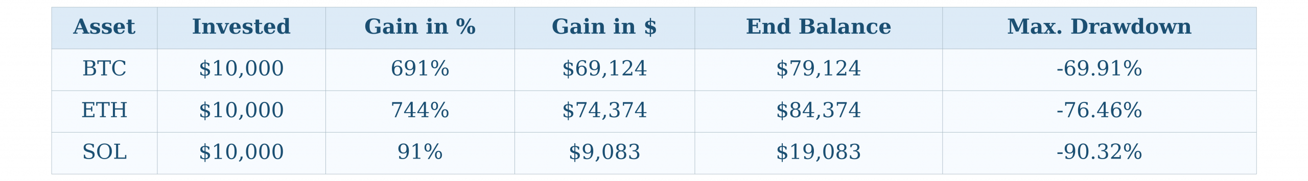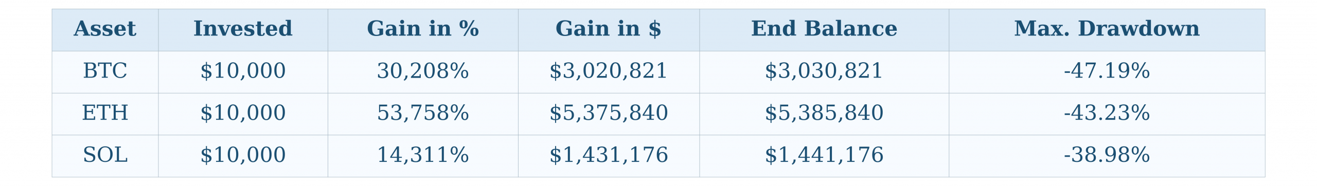 The complete backtesting results and the formulas applied in the tables can be found at BTC Complete Backtesting Results, ETH Complete Backtesting Results and SOL Complete Backtesting Results. Based on the backtesting results, the strategy approach leads to a gain as shown in the table below. The initial balance is set to $10,000. Other than in the example, the full account is used for the trades, to be able to compare them to the DCA-approach.