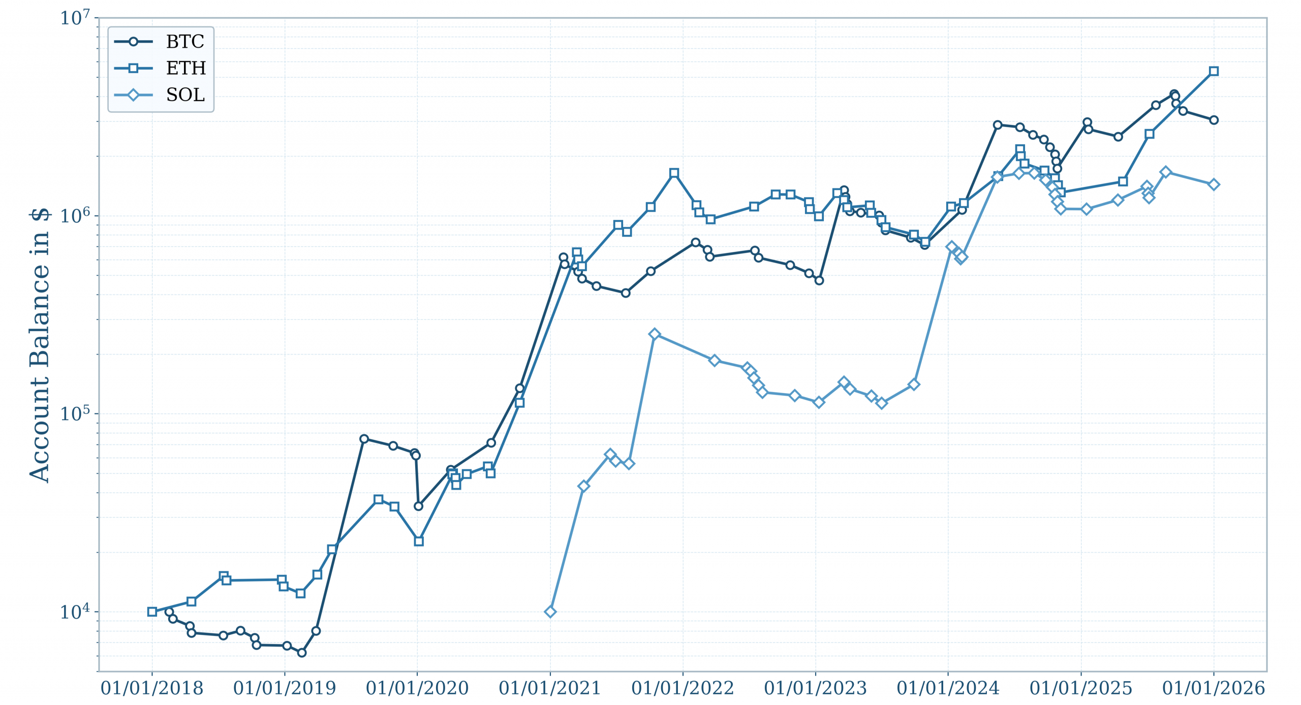 The following three tables show the performances over the years for the three assets BTC, ETH and SOL. Fees and taxes are included.