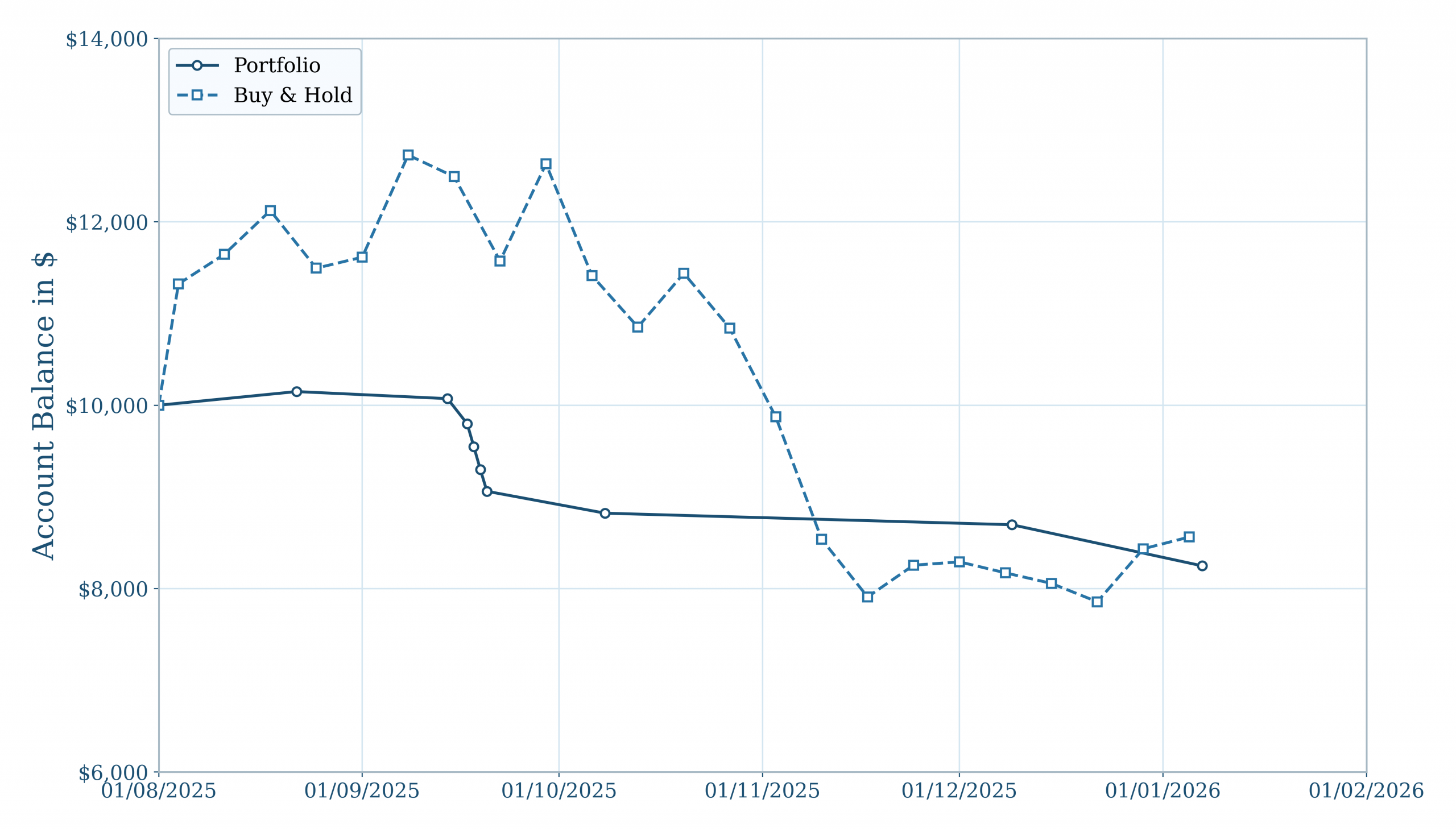 The diagram below shows the paper trading account balance since August 1st, 2025. This corresponds to the trades shown in the Trades-section of this web-site. The account starts with $10,000 and uses 33% per asset per trade. In each trade, 7.5% of the traded amount are risked. Additionally, the balance for a Buy & Hold account is shown. The Buy & Hold account purchased BTC, ETH and SOL (33 % each) at the closing price of August 1st, 2025. The data points for the Buy & Hold account are shown on a weekly basis.