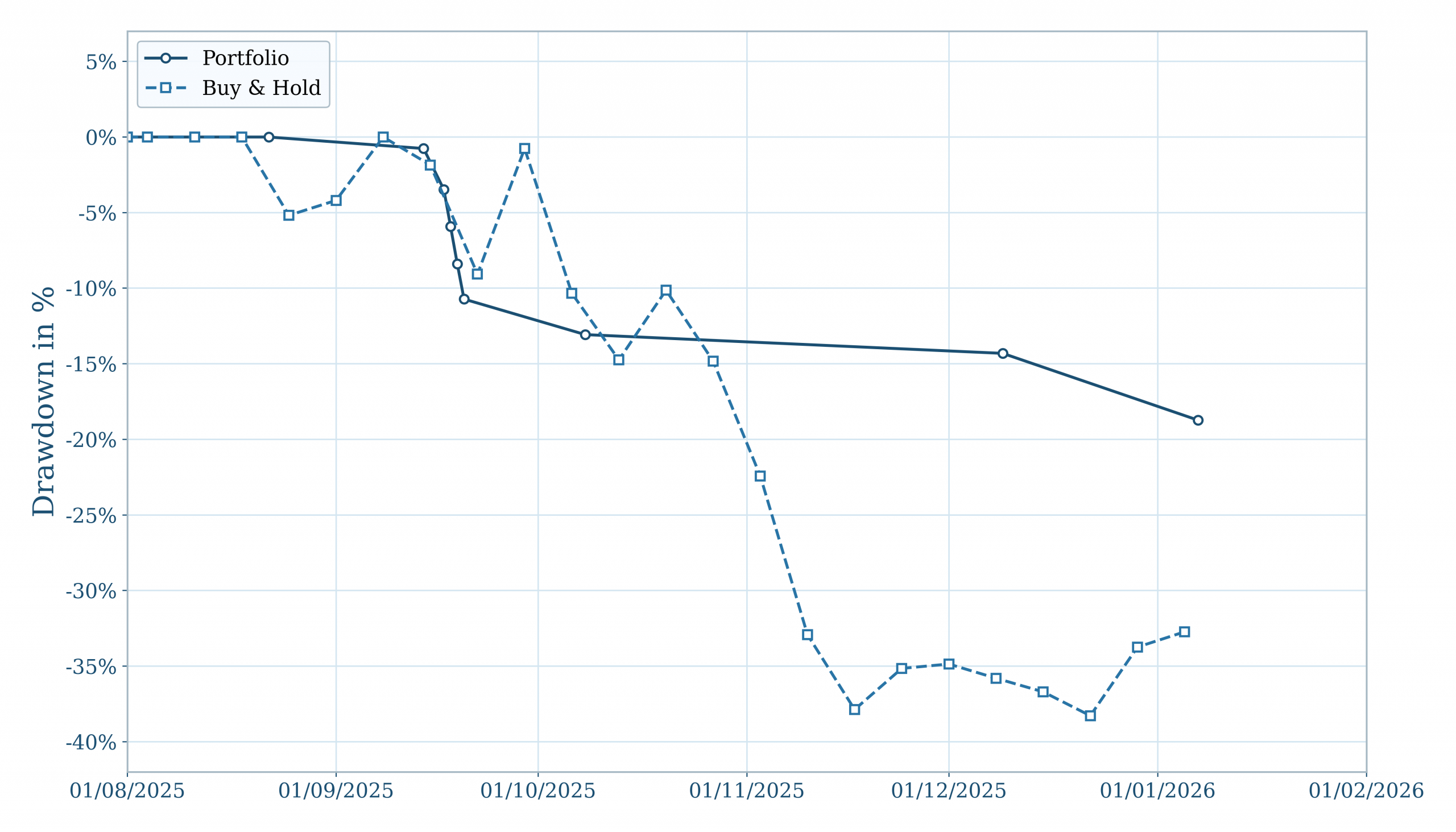 The individual trades are listed in the table below. Fees are already included in the „Balance After“ column values. Taxes, if applicable, would apply and would be included in the beginning of the next year’s first trade. For transparency: The strategy first included HBAR as well. This asset is not considered anymore but the results from 01/08/2025 are kept to show the actual unfiltered performance.